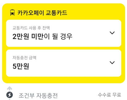 5천만원 미만일 때 선택한 금액 자동충전, 1만원 미만일 때 3만원 자동충전, 교통카드 잔액이 2만원 미만일 때 5만원 자동 충전 등 본인이 원하는대로 자동충전 금액을 선택하여 설정할 수 있습니다.