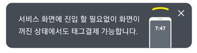 NFC 기능만 켜져 있다면 카카오페이 모바일 교통카드 서비스 화면에 진입할 필요 없이 스마트폰 화면이 꺼진 상태에서도 결제가 가능합니다.
