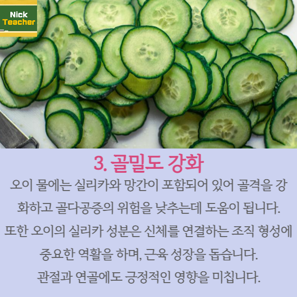 오이물에는 실리카와 망간 성분이 다량 함유되어 있어 골격을 강화하고 골다공증의 위험을 낮추는데 도움이 됩니다.
