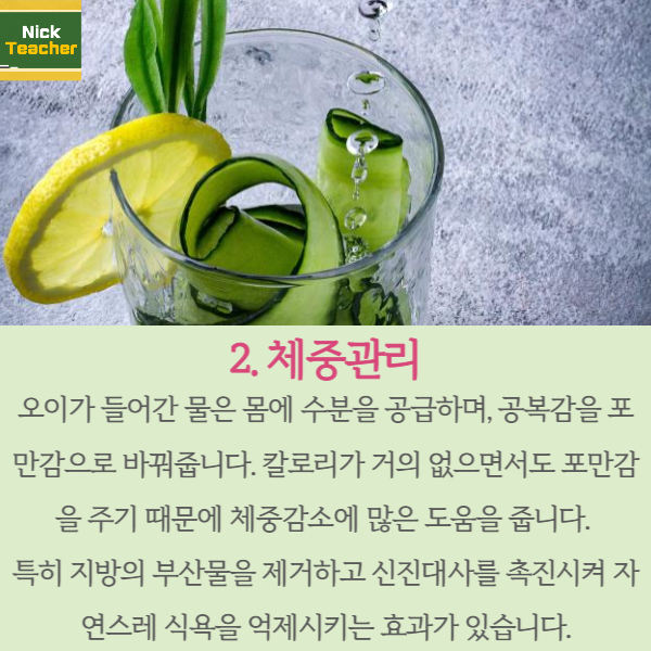 오이에 포함된 활성 영양소들이 물에 녹아 전체적인 영양소 섭취량을 증가 시킬 수 있다고 하는데요.